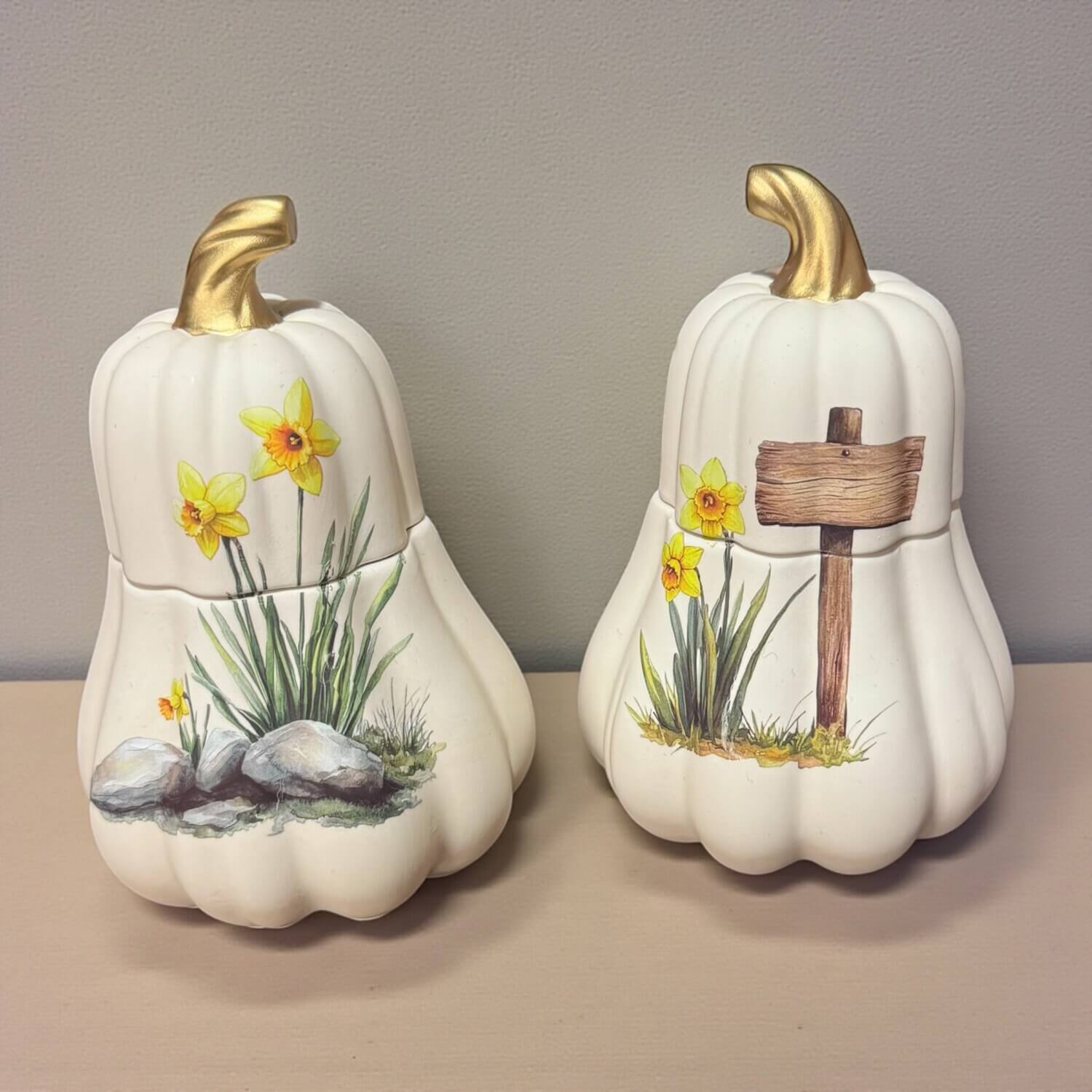 Κολοκύθα φτιαγμένη χειροποίητα από σκόνη πορσελάνης σε μπεζ αποχρώσεις με χρυσή λεπτομέρεια στο καπάκι, ιδανική για κάθε γωνιά του σπιτιού σας.