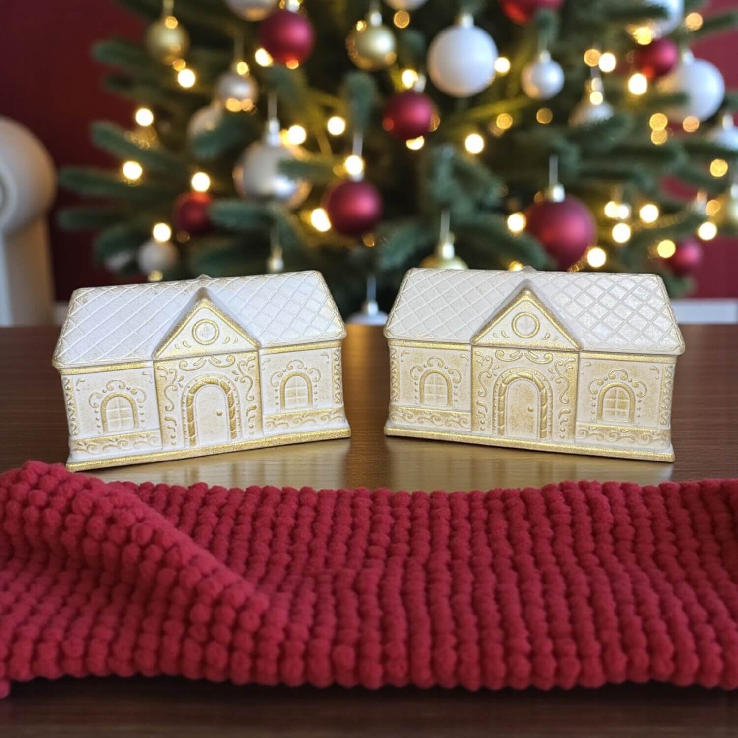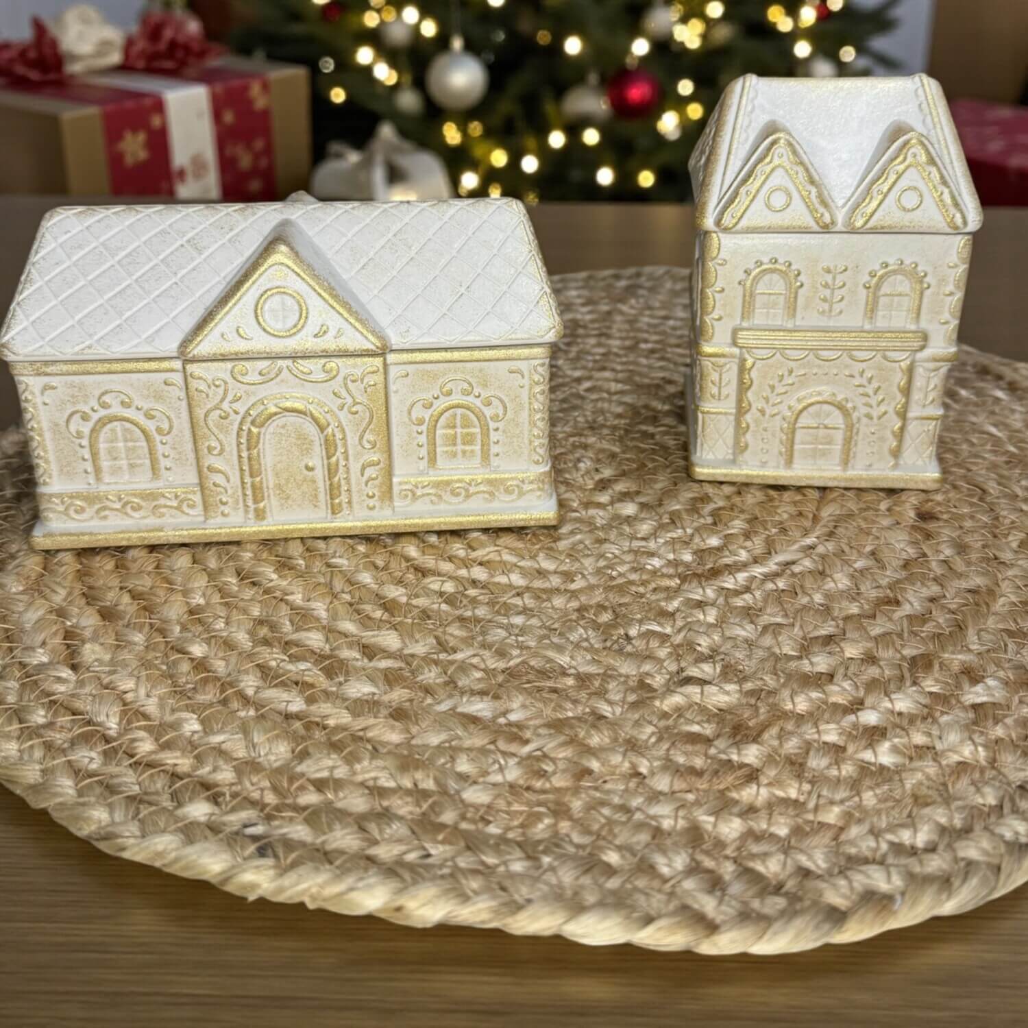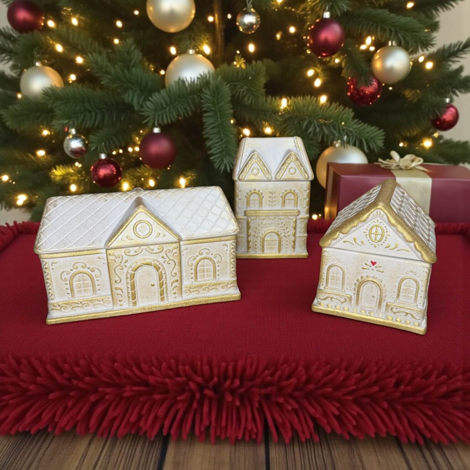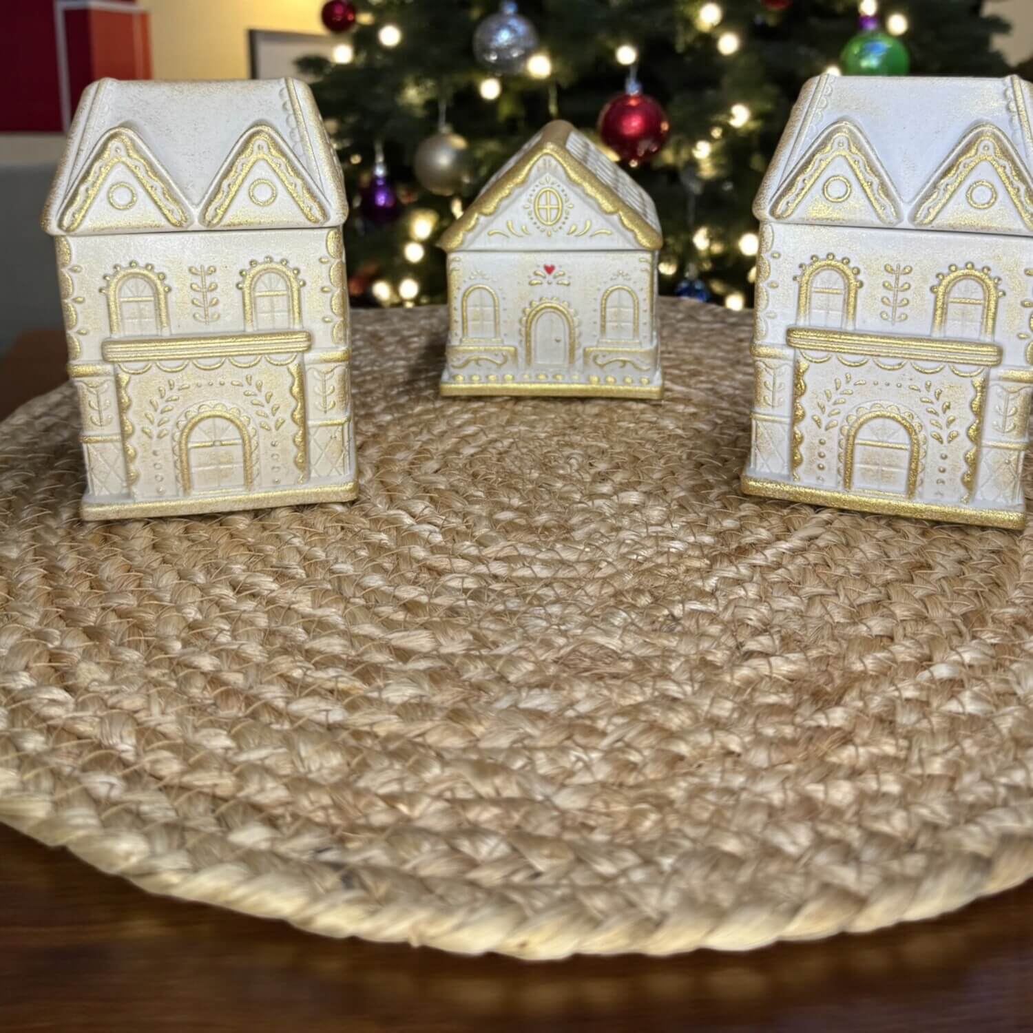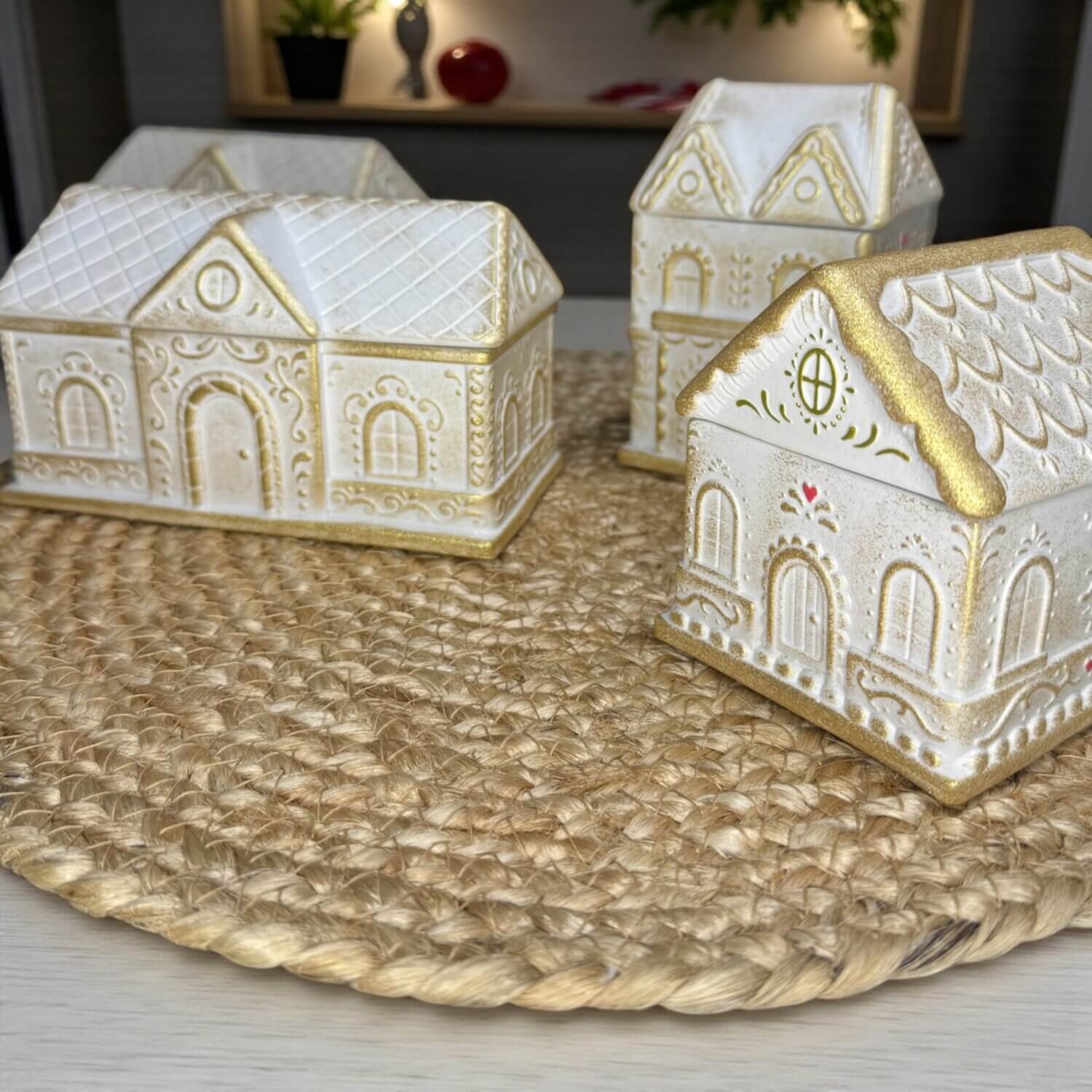 Διατίθενται σε τρία μεγέθη, με λεπτομέρειες που θυμίζουν παραμύθι και χιονισμένες σκεπές. Κάθε σπιτάκι ανοίγει και μεταμορφώνεται σε ένα κομψό μπολ όπου μπορείτε να βάλετε κερί σόγιας, σοκολατάκια ή μικροαντικείμενα.