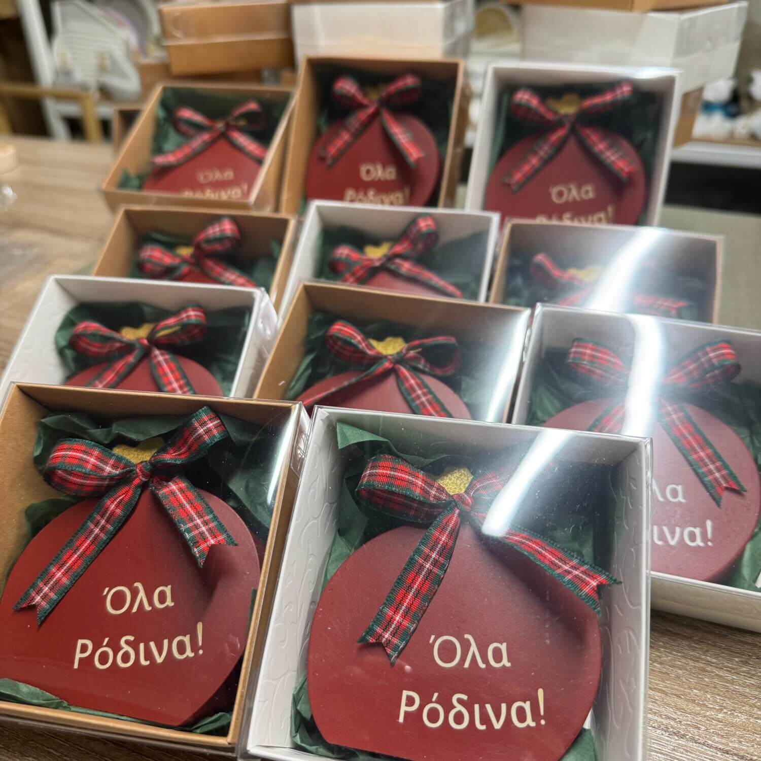 Χειροποίητο ρόδι, σύμβολο τύχης, αφθονίας και καλής χρονιάς, με χαραγμένες ευχές και το λογότυπο της εταιρίας με λέιζερ, προσφέροντας απόλυτη ακρίβεια και κομψό αποτέλεσμα.